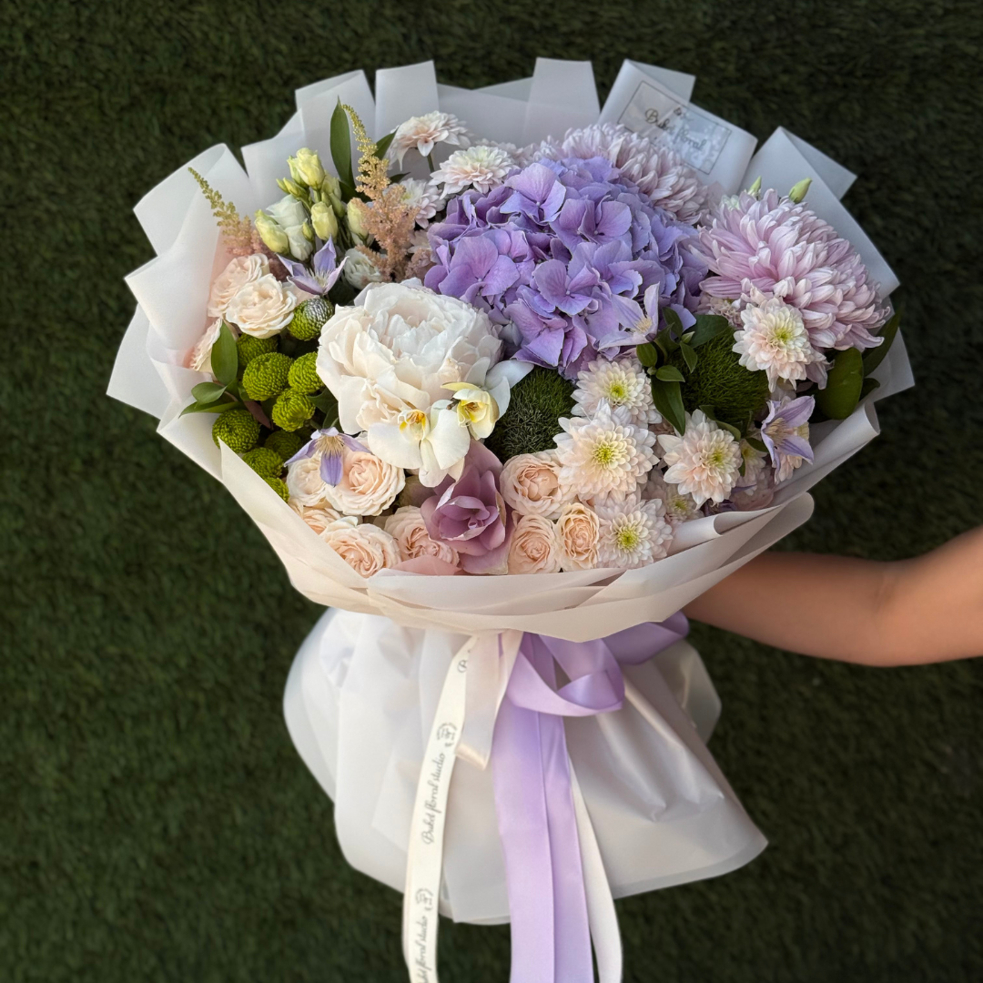 Buchet elegant în nuanțe delicate de mov și crem, format din hortensii mov, bujori albi, crizanteme roz pal, trandafiri crem, lisianthus mov și alb, craspedia verde și accente de astilbe roz.
