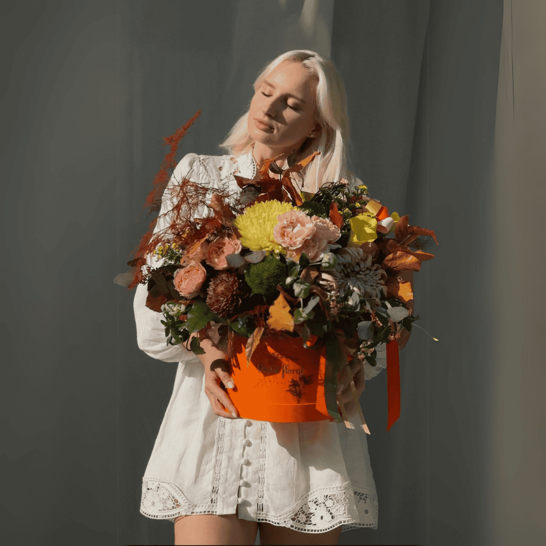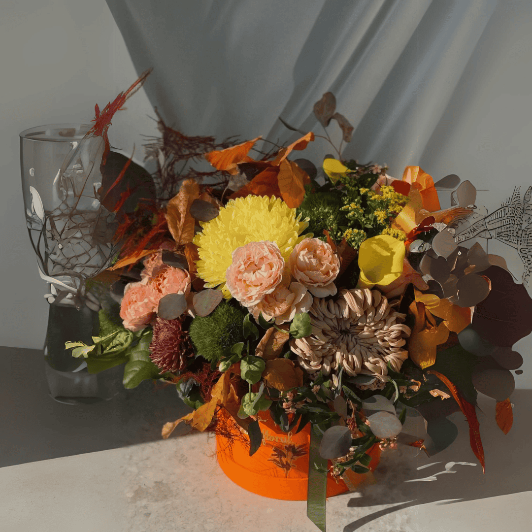 O compoziție florală vibrantă, ce combină eleganța Crizantemei Viena cu rafinamentul trandafirilor spray Juliet Garden și naturalețea frunzelor stabilizate. Cu nuanțe calde de portocaliu și galben, această cutie florală evocă căldura și frumusețea toamnei.