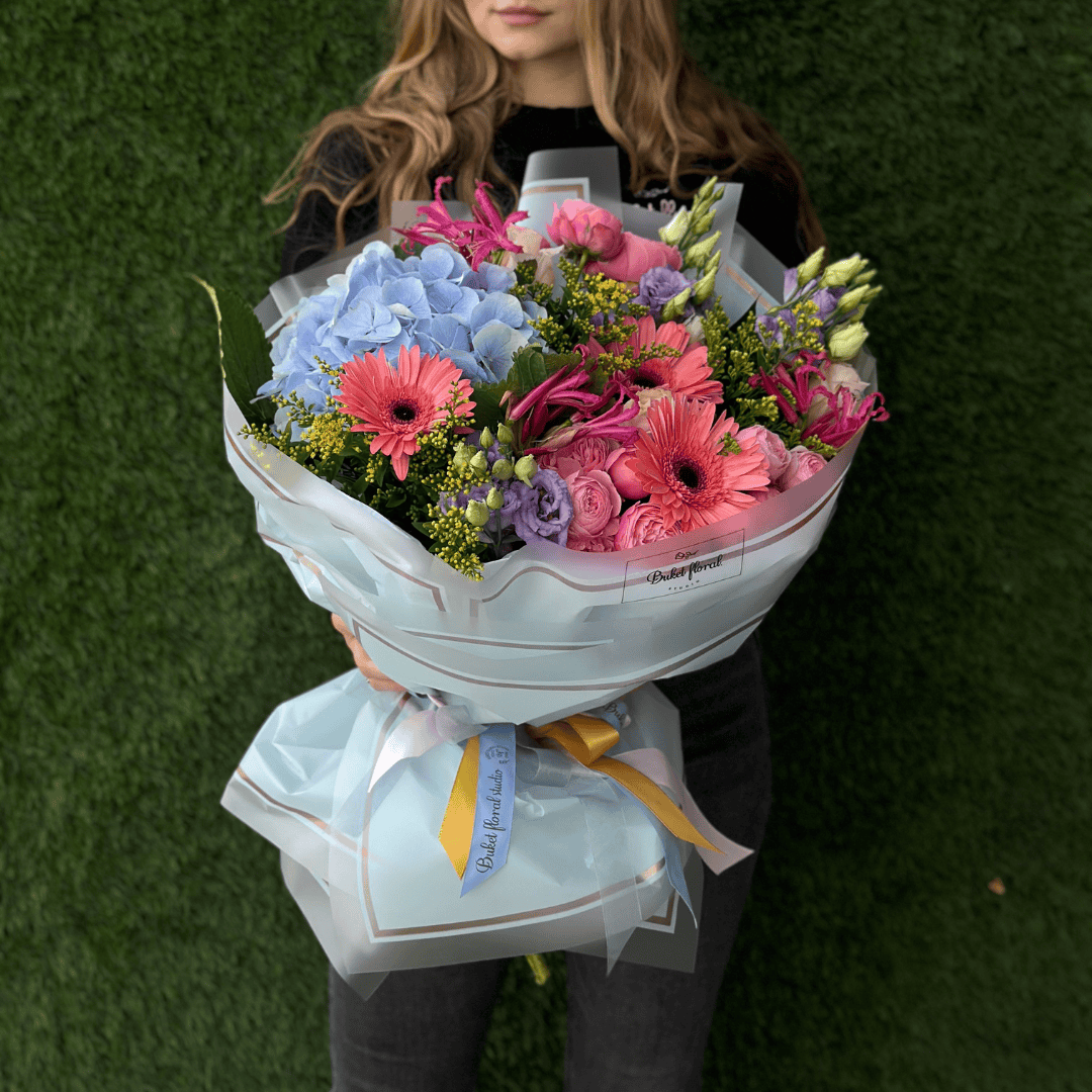 Acest buchet îmbină armonios delicatețea hortensiei albastre cu eleganța trandafirilor Silva Pink și misterul eustomelor. Este alegerea ideală pentru momentele în care vrei să exprimi emoții autentice și să aduci un zâmbet de neuitat. În caz că nu avem toate florile în stoc, floriștii noștri vor ajusta varietatea, dar vor păstra aceleași culori și bugetul.