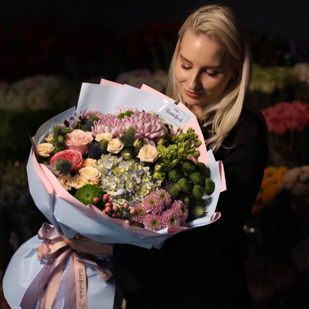 Un buchet sofisticat și plin de personalitate, în nuanțe pastelate de roz, bleu, verde și crem, realizat dintr-o selecție armonioasă de hortensii, trandafiri, crizanteme, flori decorative și texturi verzi vibrante. Este un aranjament modern, expresiv și elegant, ideal pentru aniversări, evenimente speciale, surprize romantice sau cadouri de impact, care transmite rafinament, prospețime și bucurie.