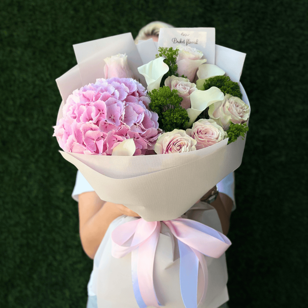 Un buchet elegant și delicat, perfect pentru a transmite sensibilitate și căldură într-un mod subtil, dar memorabil. Fiecare floare este atent aleasă pentru a crea un echilibru vizual deosebit. În caz că nu avem toate florile în stoc, floriștii noștri vor ajusta varietatea, dar vor păstra aceleași culori și bugetul.