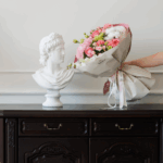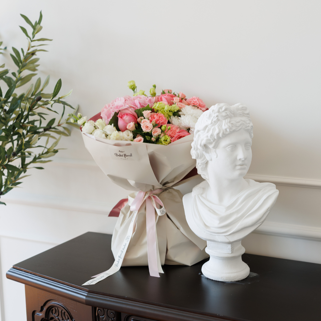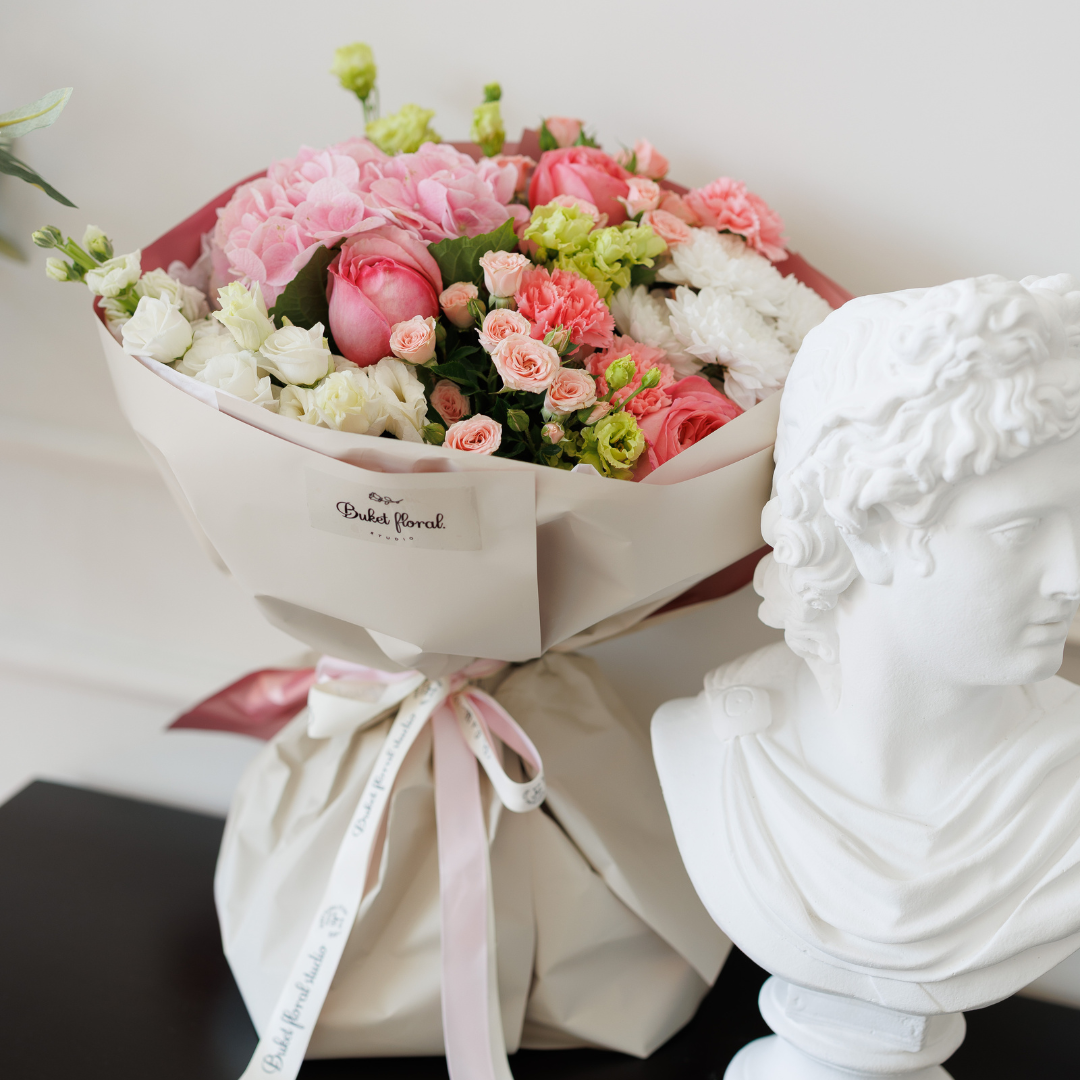 Un buchet minimalist, dar cu personalitate — în nuanțe calde de roz pal, cu un mix delicat de flori atent alese.
