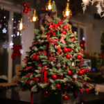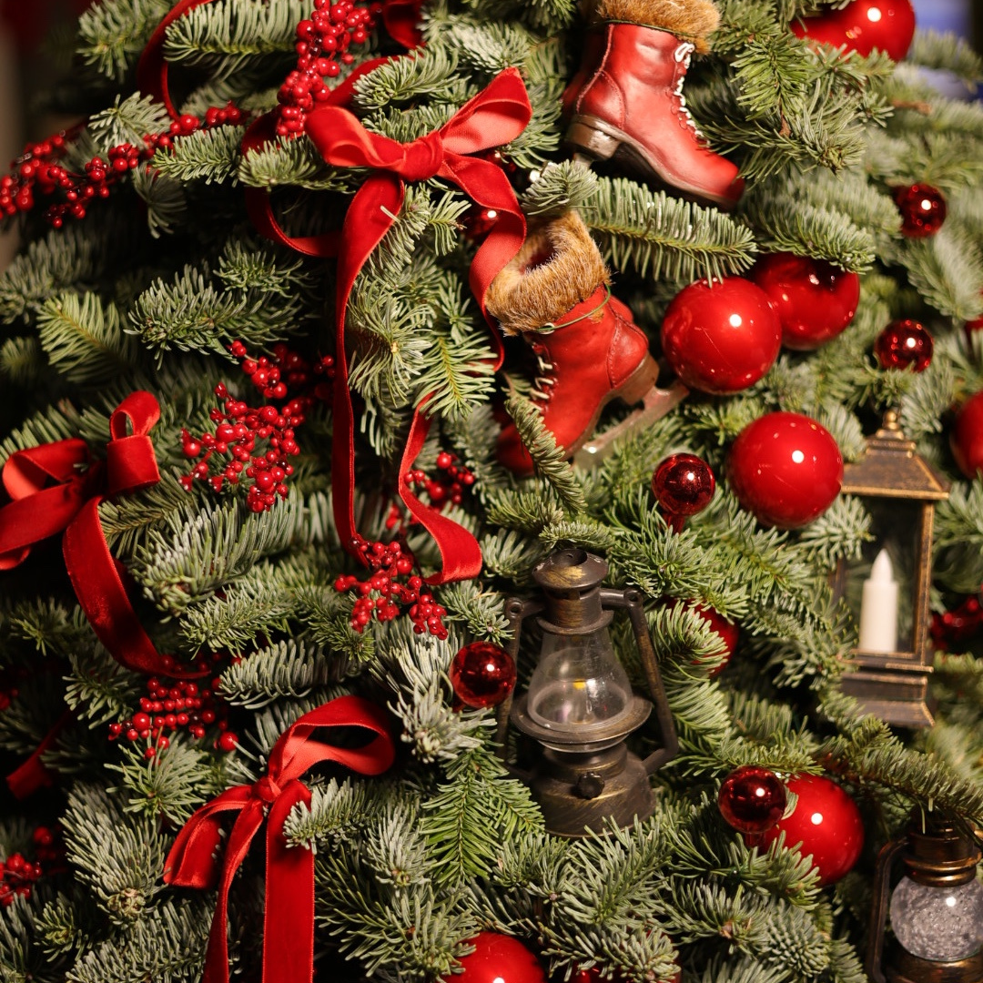 Brăduț natural spectaculos, bogat decorat cu globuri roșii, funde elegante, bobițe decorative și ornamente tematice de Crăciun, creat pentru a aduce un aer tradițional, cald și plin de farmec în orice spațiu festiv.