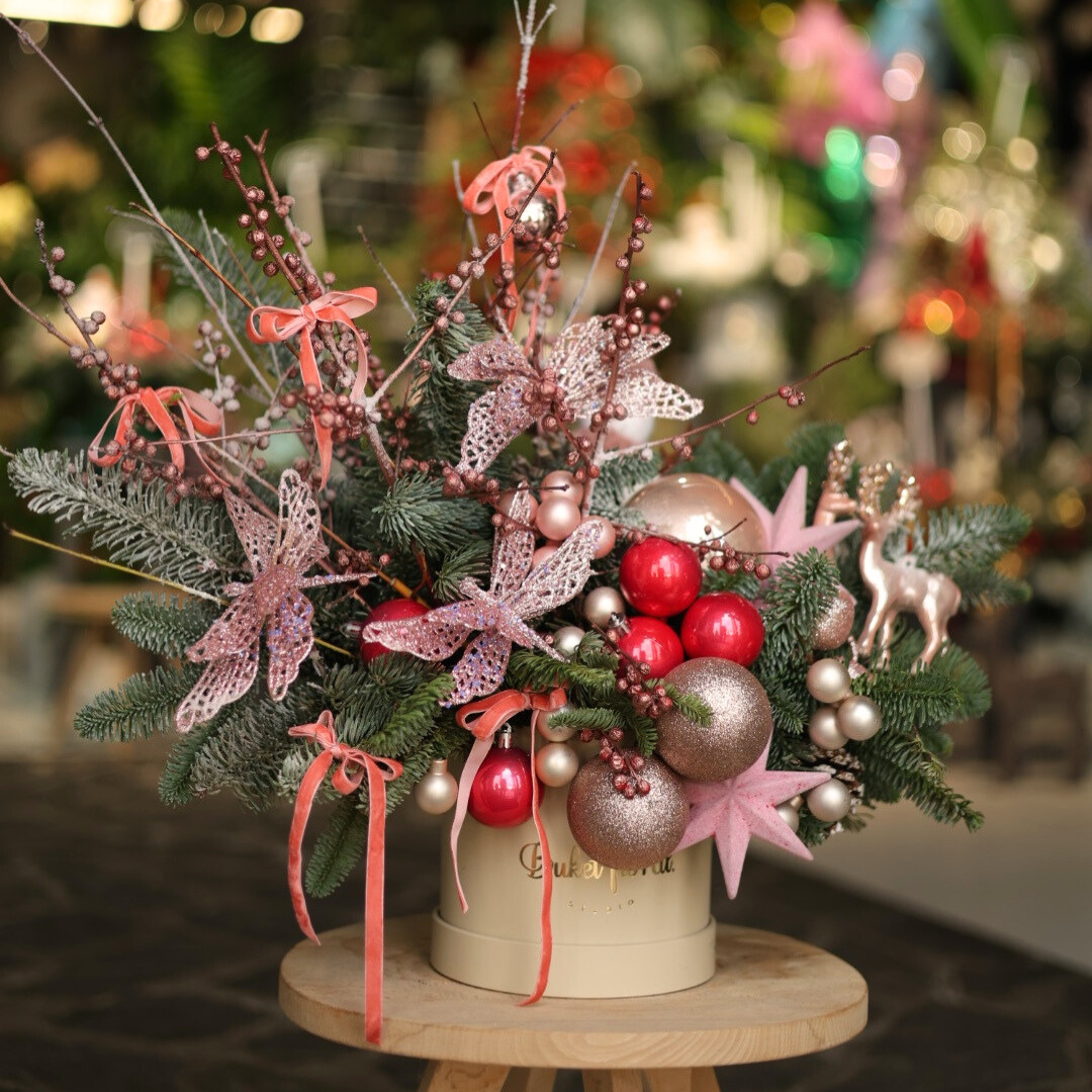 Compoziție festivă realizată din crenguțe de brad natural, decorată cu globuri în nuanțe de roșu, roz și auriu, accente strălucitoare și detalii elegante. Un aranjament rafinat, ideal pentru decorul de sărbători sau pentru a fi oferit cadou, prezentat într-o cutie elegantă.