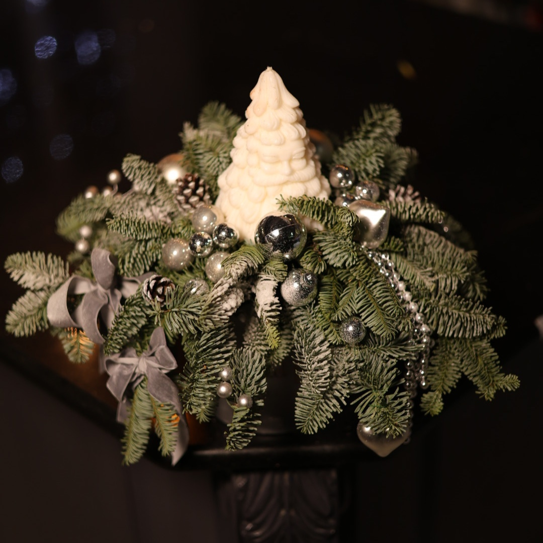 Compoziție elegantă din brad natural, completat cu ornamente argintii, fundă delicată și lumânare decorativă centrală, creat pentru a aduce un plus de rafinament, calm și atmosferă festivă în decorul de Crăciun.