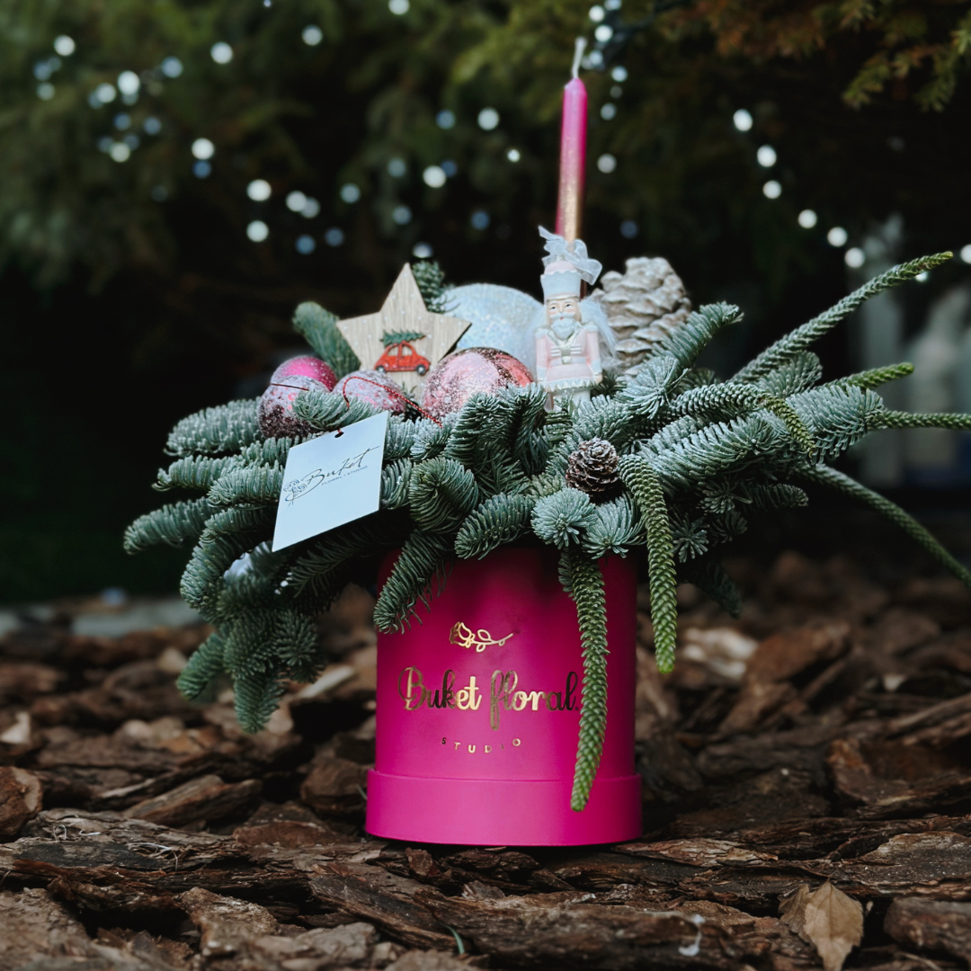Aranjament festiv realizat cu brad natural, decorat cu globuri strălucitoare, elemente tematice de sezon, conuri și lumânare, așezat într-o cutie elegantă fuchsia. Ideal pentru decorul de sărbători sau ca un cadou special.