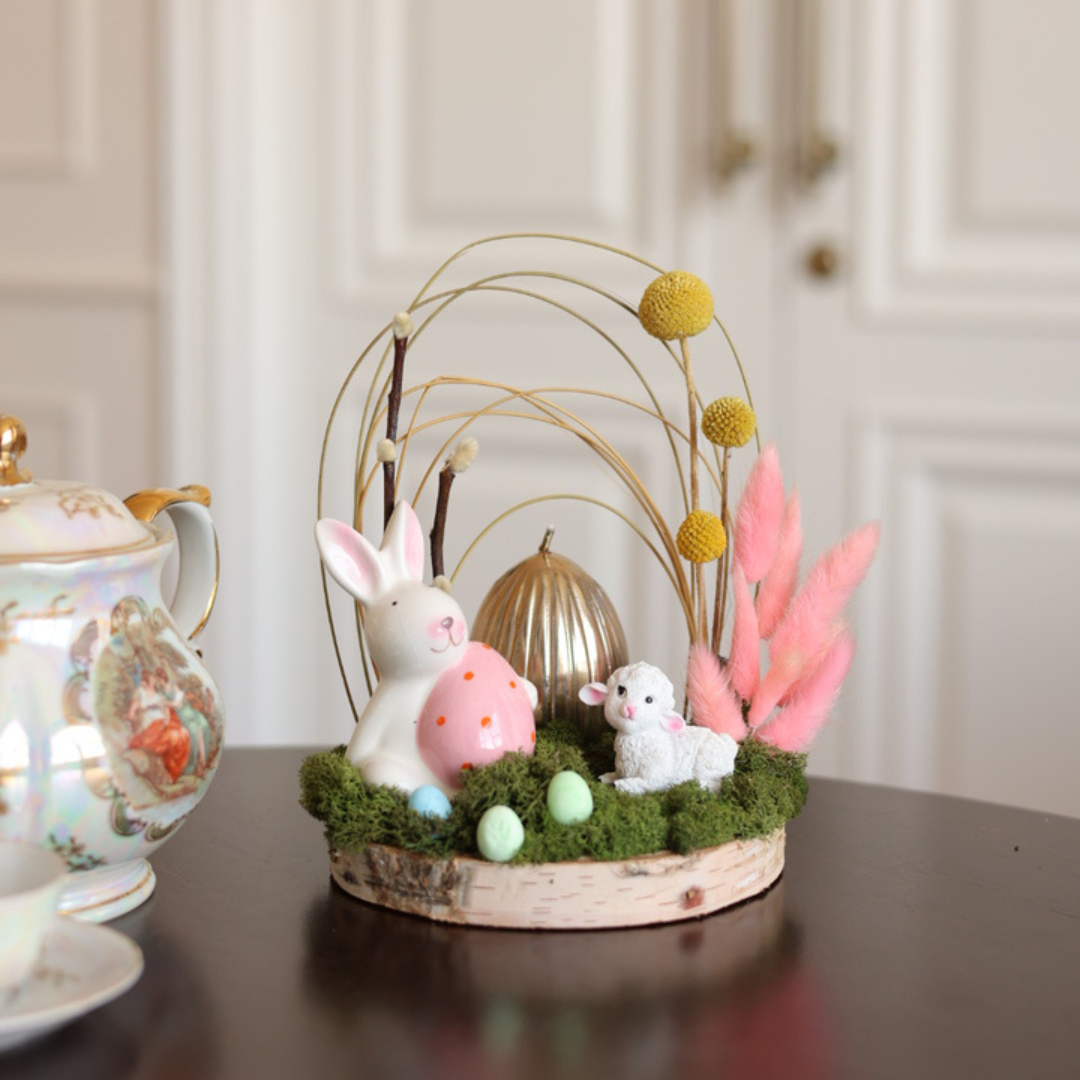 Aranjament decorativ de Paște, realizat pe bază de mușchi natural, cu elemente jucăușe precum iepuraș, mielușel și ouă pastelate. Accentele florale și detaliile moderne creează o compoziție veselă și elegantă, ideală pentru decorul de sezon.