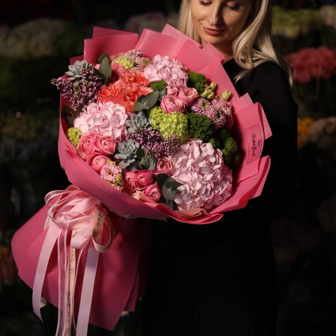 Un buchet spectaculos și vibrant, în nuanțe intense de roz, coral și verde proaspăt, compus din hortensii, trandafiri, crizanteme, flori decorative și accente moderne de suculente și verdeață. Acest aranjament emană energie, feminitate și eleganță, fiind alegerea perfectă pentru aniversări, zile de naștere, surprize romantice sau cadouri statement care impresionează prin volum și culoare.