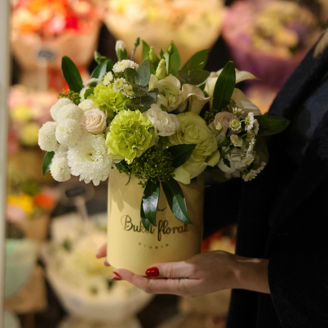 Un aranjament proaspăt și luminos, realizat într-o cutie ivoire, cu flori în nuanțe de alb, crem și verde lime.