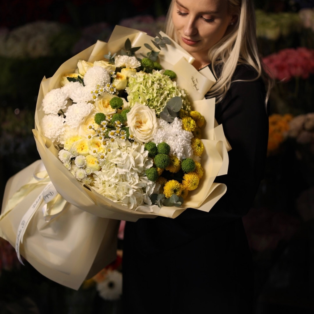 Un buchet luminos și elegant, în tonuri calde de ivory, crem, galben delicat și verde proaspăt, compus din hortensii, trandafiri, crizanteme, flori de mușețel și accente naturale de verdeață. Acest aranjament emană prospețime, rafinament și optimism, fiind ideal pentru aniversări, evenimente speciale, mulțumiri sau cadouri care transmit bucurie și căldură.