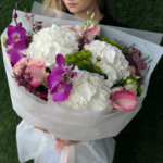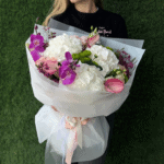 O expresie de rafinament pur, compus din hortensie delicată, orhidee phalaenopsis și cală, toate îmbrăcate într-un ambalaj sofisticat. Armonia florilor și texturile lor adaugă o notă de lux și echilibru, făcând acest buchet potrivit pentru ocazii speciale.