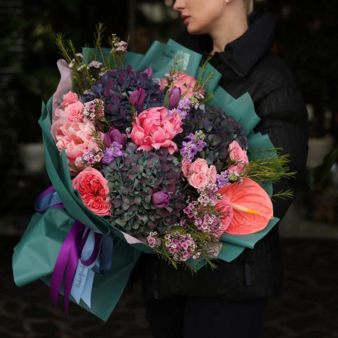 O compoziție florală dramatică și sofisticată, ce îmbină hortensii în nuanțe profunde, bujori roz intens, miniroze pastel, tulipane mov, anthurium corai și accente fine de floricele liliachii. În cazul în care nu sunt toate florile în stoc, floriștii noștri vor modifica varietatea florilor păstrând gama de culori și bugetul acestuia.
