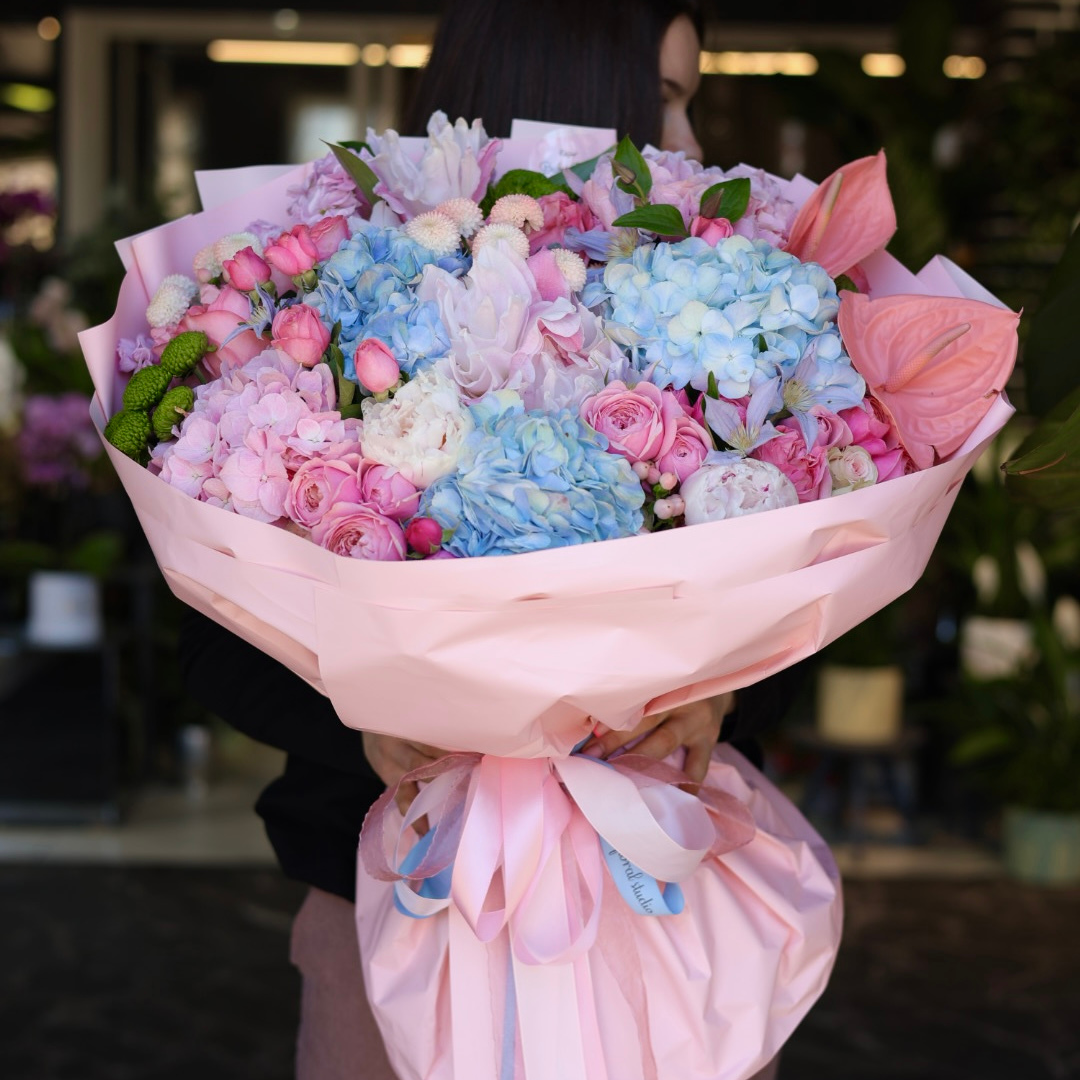Un buchet spectaculos în nuanțe pastelate de roz și albastru, unde hortensiile, trandafirii și anthurium creează o compoziție delicată și elegantă. Perfect pentru a transmite admirație, gingășie și emoții speciale într-un mod memorabil.