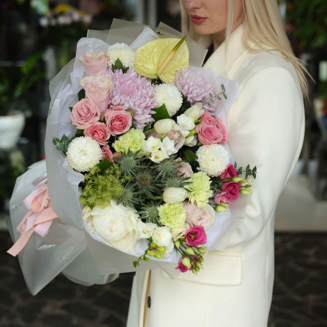 Un buchet rafinat și armonios, creat din flori fine în nuanțe diafane de roz pal, alb, crem și verde deschis.