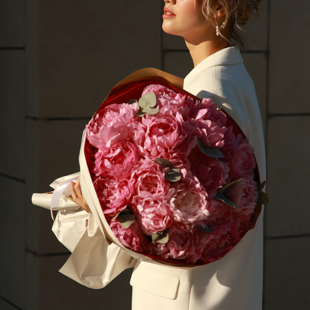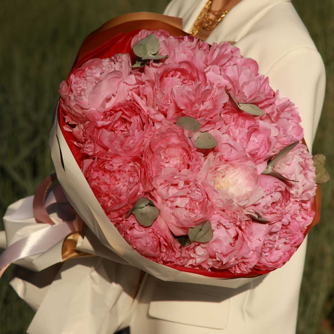 Un buchet spectaculos format exclusiv din bujori în nuanțe de roz intens, simbol al eleganței și feminității. Perfect pentru ocazii speciale sau pentru a oferi un gest deosebit plin de rafinament.