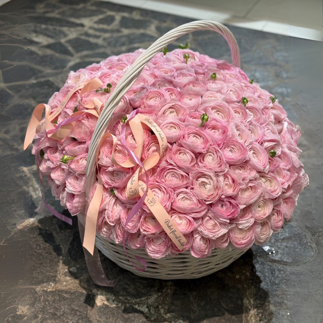 Un coș spectaculos, plin cu 250 de ranunculus roz, ce aduce o explozie de culoare și delicatețe. Fiecare floare în acest coș este un simbol al eleganței și al feminității, perfect pentru a marca un moment special sau a face o impresie memorabilă.
