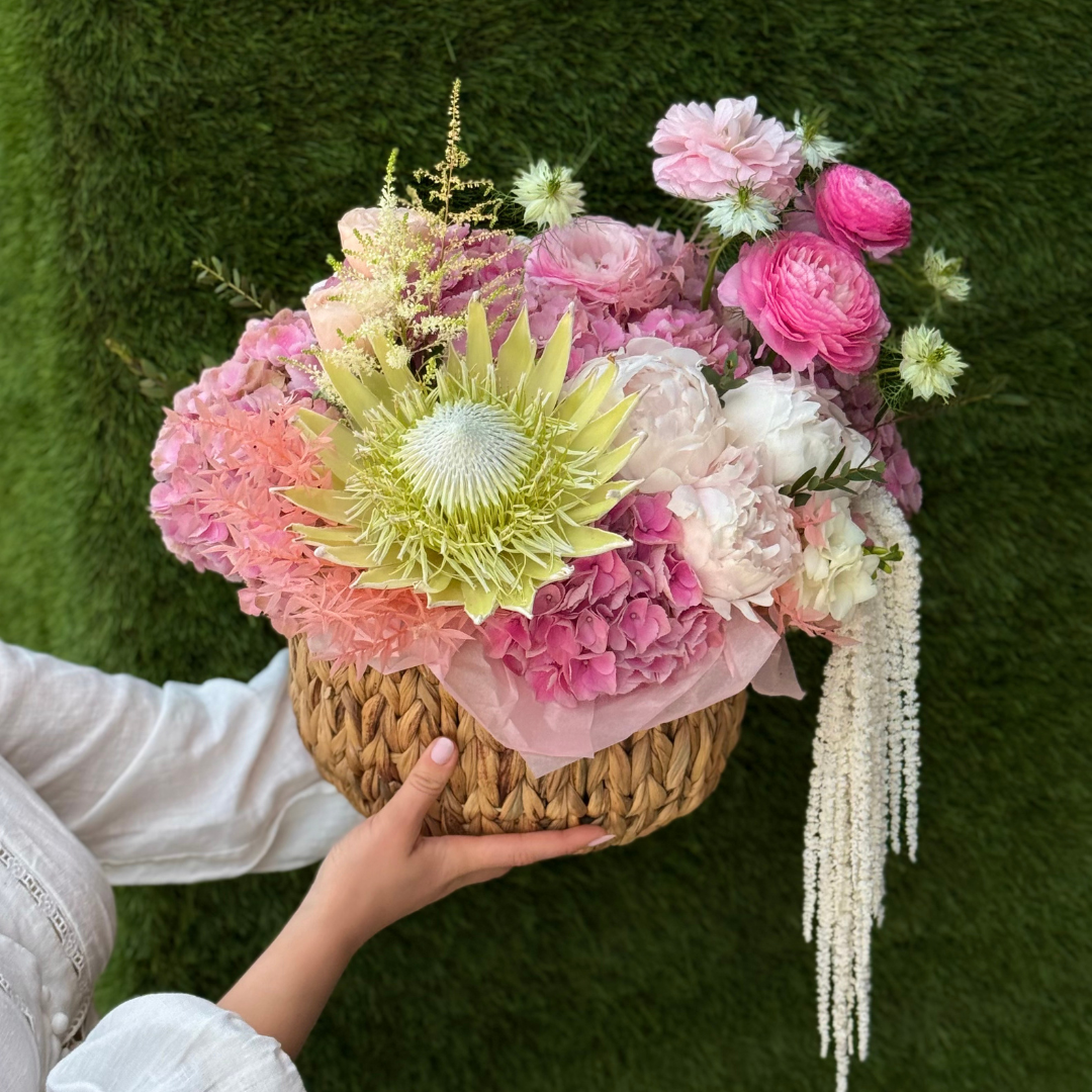 Aranjament floral spectaculos în coș împletit, compus din protea regală, hortensii roz în diverse nuanțe, bujori albi și roz pal, ranunculus roz intens, astilbe roz pal și accente delicate de nigella și amaranthus alb în cascadă. Combinația de culori și texturi oferă un efect luxuriant și inedit, perfect pentru un cadou de impact.