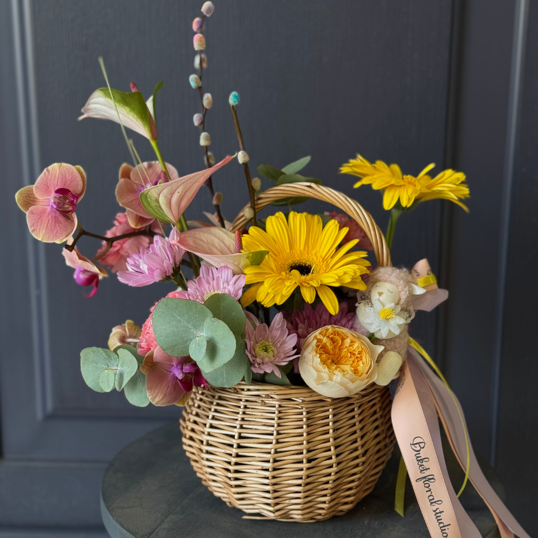 Un coș plin de energie pozitivă, cu combinații de roz delicat și galben vibrant, perfect pentru a aduce bucurie și prospețime în sărbătorile pascale.