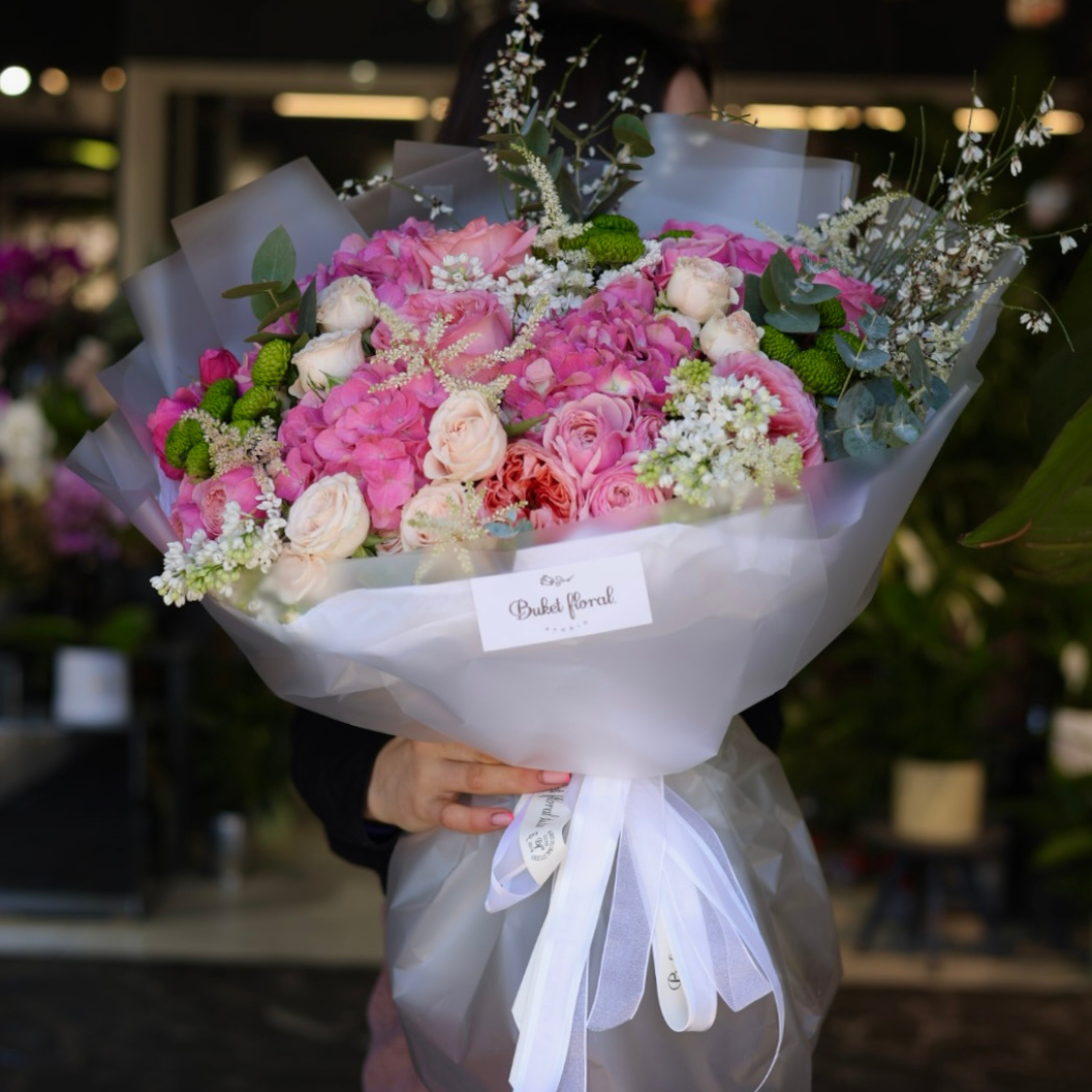 Un buchet luxuriant în nuanțe vibrante de roz și crem, unde hortensiile și trandafirii sunt completate de accente delicate de verdeață și flori fine de sezon. O alegere spectaculoasă pentru a impresiona și a transmite emoții profunde și rafinate.