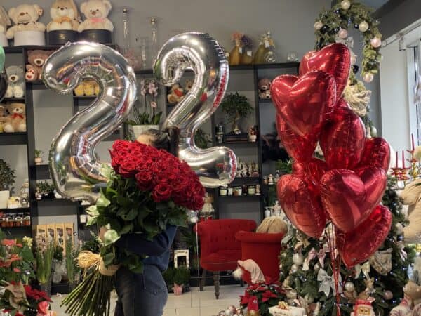 Set format din cifre argintii (va rugam sa indicati cifrele necesare in comentariu ) si 11 baloane rosii in forma de inima !