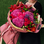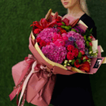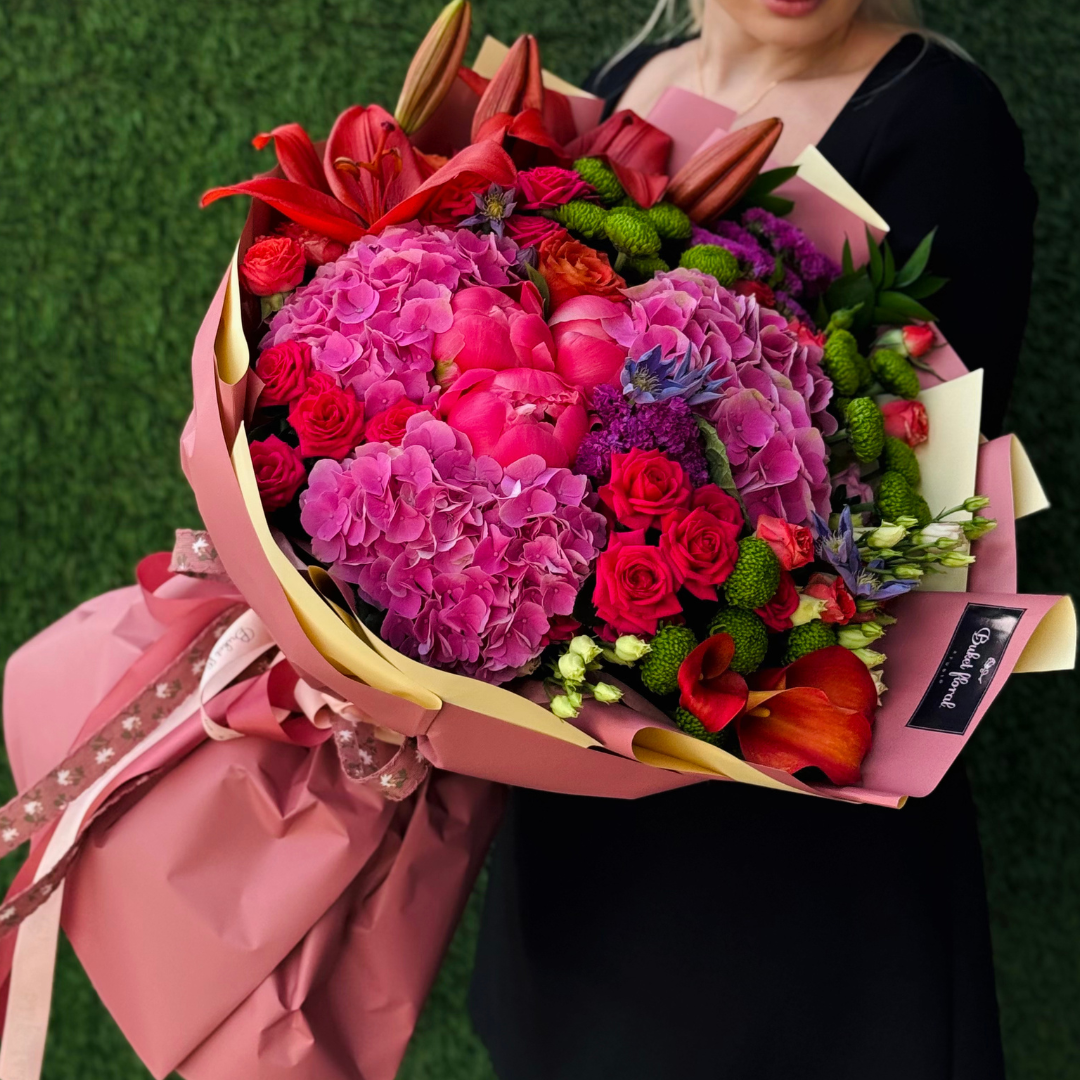 Un buchet vibrant, plin de pasiune și rafinament. Fiecare floare adaugă o notă proprie acestei compoziții bogate, creând un aranjament care emană emoție, frumusețe și expresivitate.